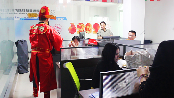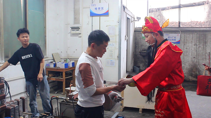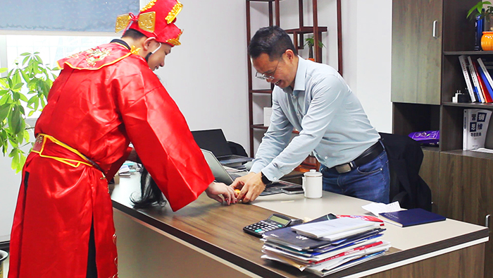 这是飞瑞科开工最热闹的一幕:平日里严谨认真的技术师傅们,此刻都笑得像个孩子,争相和财神爷握手拥抱;忙碌的装配线旁,财神爷挨个工位派发幸运金币巧克力和开运福袋。
