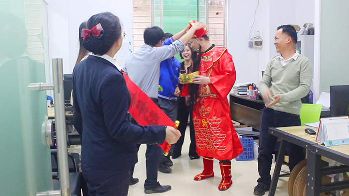 这是飞瑞科开工最热闹的一幕:平日里严谨认真的技术师傅们,此刻都笑得像个孩子,争相和财神爷握手拥抱;忙碌的装配线旁,财神爷挨个工位派发幸运金币巧克力和开运福袋。